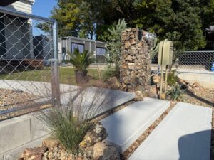 門柱にはワイヤーメッシュに自然石を詰めたガビオンを使用