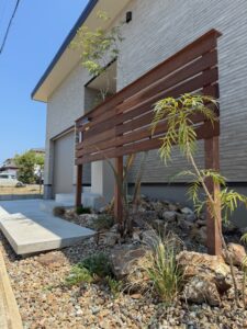 木の温もりを感じるフェンスと表情豊かな自然石を組み合わせることで、シンプルでありながら奥行きのある空間を演出しています