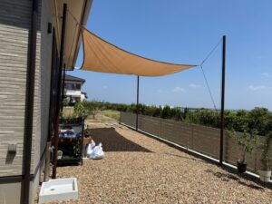 開放的な庭にはシェードを設置し、日差しをコントロールしながら快適に過ごせる空間に仕上げています